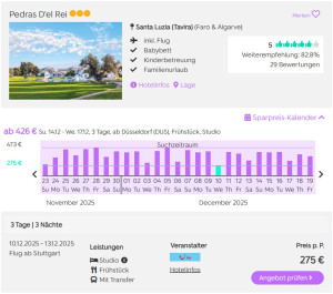 Bei Ihrer Pauschalreise an die Algarve können Sie sich auch im Dezember noch auf angenehm warme Temperaturen und Sonne satt freuen. Relaxen Sie am Strand, vergnügen Sie sich beim Wassersport und entdecken Sie beim Sightseeing einige der vielen Sehenswürdigkeiten der Region. Neben den atemberaubenden Steilküsten sind vor allem Städte wie Faro, Lagos oder Sagres überaus sehenswert. Unternehmen Sie auch Bootstouren auf dem Atlantik, besichtigen Sie imposante Höhlen oder feilen Sie an Ihrem Handicap auf einem der Golfplätze der Algarve. Die kulinarischen Köstlichkeiten der Region machen Ihre Reise nach Portugal obendrein zu einem Freudenfest für den Gaumen.