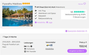 Die Malediven sind ein echtes Sehnsuchtsziel und diese Reise wird Sie begeistern. Schnell buchen und schon bald im Urlaubsparadies entspannen.