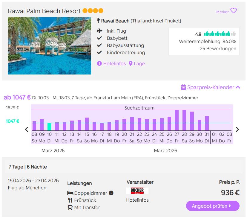 Genießen Sie mit unserem aktuellen Reise-Deal eine herrliche Urlaubswoche auf der paradiesischen Insel Phuket und freuen Sie sich auf weiße Sandstrände am türkisblauen Meer, zauberhafte Landschaften und die faszinierende thailändische Kultur.