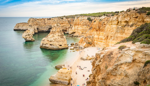 Der wohl schönste Strand der Algarve ist der Praia da Marinha, der rund 5 km vom Urlaubsort Carvoeiro entfernt liegt. Der Strand ist von einzigartigen Felsformationen umgeben, darunter spektakulären Felssäulen im Meer, welche die Kulisse hier zusammen mit dem kristallklaren Wasser und dem hellen Sand wahrlich atemberaubend machen. Urlauber können hier wunderbar baden, tauchen oder schnorcheln. Durch die Felsen ist der Strand windgeschützt, sodass es sich selbst im Winter wunderbar an ihm aushalten lässt. Im Sommer werden an diesem Strand Bootsausflüge zu den größten Meeresgrotten der Algarve angeboten.