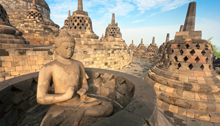 Etwa 25 Kilometer nordwestlich der für ihre Batikkunst berühmten Stadt Yogyakarta befindet sich auf der Insel Java ein imposantes Weltkulturerbe der UNESCO. Die buddhistische Tempelanlage Borobudur zählt zu den größten ihrer Art in ganz Südostasien. Der pyramidenförmige Bau gilt als bedeutendstes Relikt des Mahayana-Buddhismus.Darüber hinaus ist Borobudur eine wichtige Stätte der javanischen Geschichte. Auf den Reliefs der Tempelanlage sind Szenen aus dem bäuerlichen und höfischen Leben des 9. Jahrhunderts dargestellt. Im Archäologischen Museum von Borobudur werden zahlreiche Buddhas und Originalsteine der Anlage präsentiert, die eine Vorstellung von der einstigen Pracht des Tempels vermitteln.